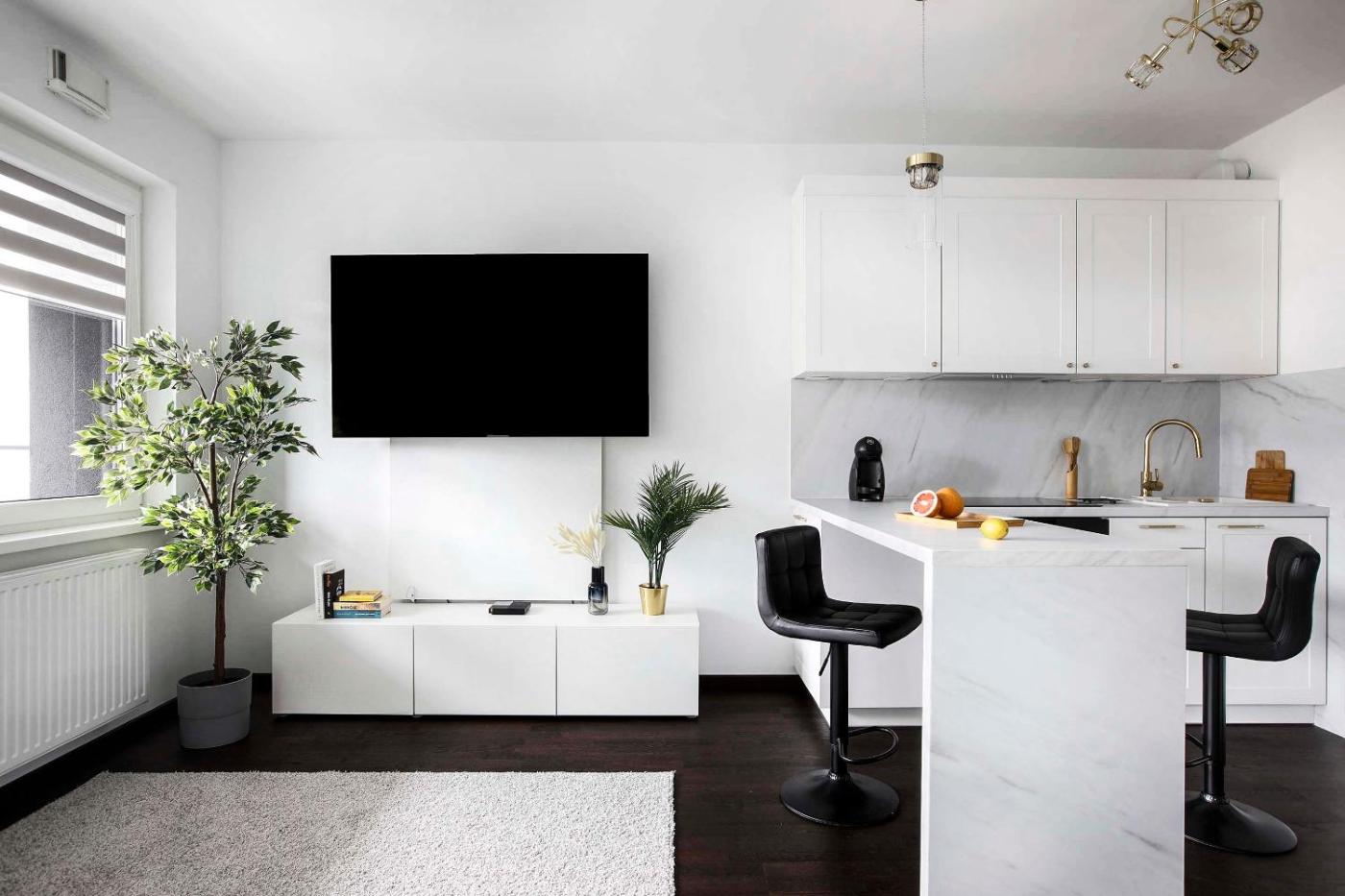 Studio z balkonem. The studio provides a seating area, a dining area, as well as a private bathroom featuring a walk-in shower and a hairdryer. In the well-fitted kitchen, guests will find a stovetop, a refrigerator, kitchenware and an oven. The air-conditioned studio offers a flat-screen TV with cable channels, a washing machine, a private entrance, a tea and coffee maker as well as city views. The unit offers 1 bed. Studio - 2 osobowy. Powierzchnia pokoju ok.: 30 mkw.