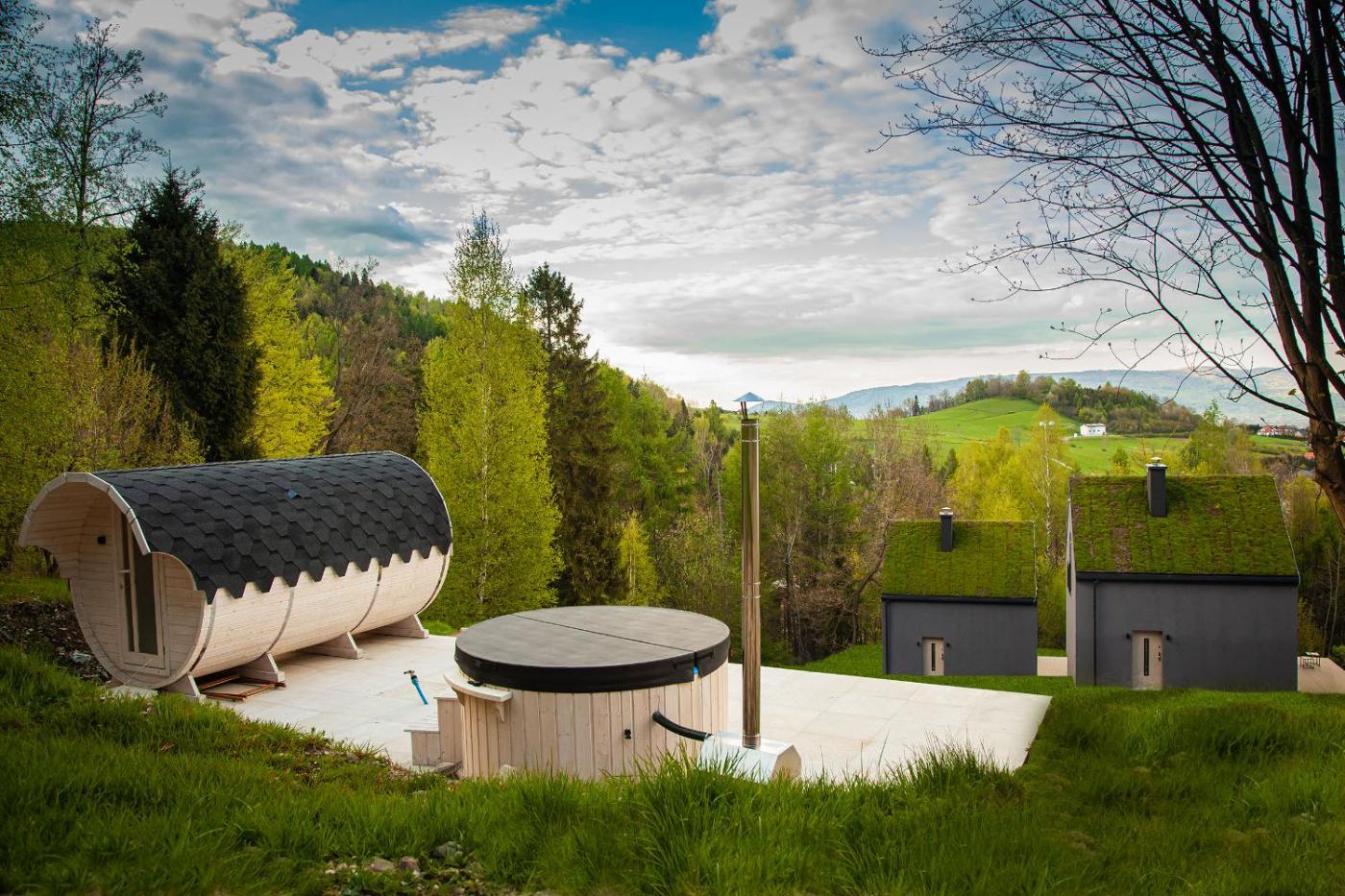 Zaplecze odnowy biologicznej obiektu EKO ZAKĄTEK obejmuje saunę i wannę z hydromasażem.